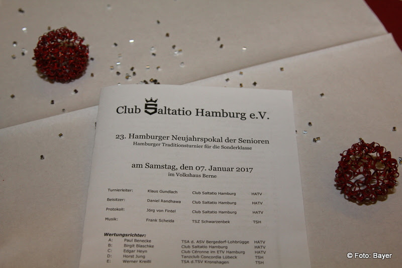 Kälte, Blitzeis und spiegelglatte Straßen – pünktlich zum 23. Hamburger Neujahrspokal im Volkshaus Berne am 07.01.2016, hatte der Winter zugeschlagen und seine eisigen Fühler ausgestreckt. An den zahlreichen Abmeldungen zu den Wettbewerben der Senioren II – IV S Paare war dies deutlich zu merken. Wer dennoch den Ausflug ins Volkshaus wagte, wurde mit leckerem Kuchen und heißem Kaffee zum Aufwärmen belohnt und durfte beim Tanzen um die drei begehrten Trophäen ordentlich ins Schwitzen zu kommen.