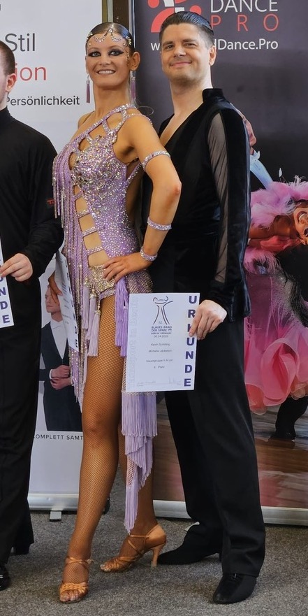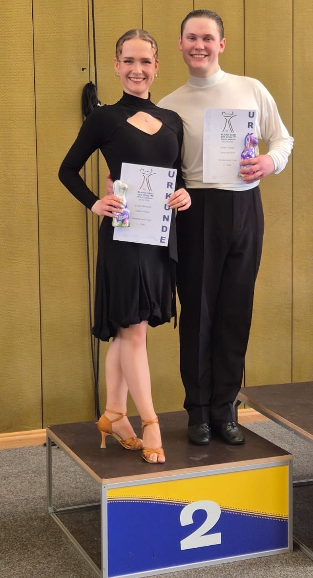 Manuel Max/Swantje Kunz tanzten ihr erstes gemeinsames Lateinturnier in der Senioren I D Latein. Nach einem General Look mit fünf Paaren konnten die beiden auch im Finale sehr überzeugend ihre Choreografien präsentieren. Mit drei ersten Plätzen in der Samba, im Cha-Cha-Cha und im Jive durften sie auf die oberste Stufe des Treppchens steigen und sicherten sich den Sieg! Im Anschluss durften sie somit als Sieger in der Senioren I C Latein mittanzen und zum ersten Mal ihren Paso Doble aufs Parkett bringen. Auch hier zeigten sie sich souverän und ertanzten sich in der höheren Klasse einen großartigen 4. Platz von 6 Paaren. Ein erfolgreicher Einstieg in die Lateinkategorie für Manuel und Swantje!